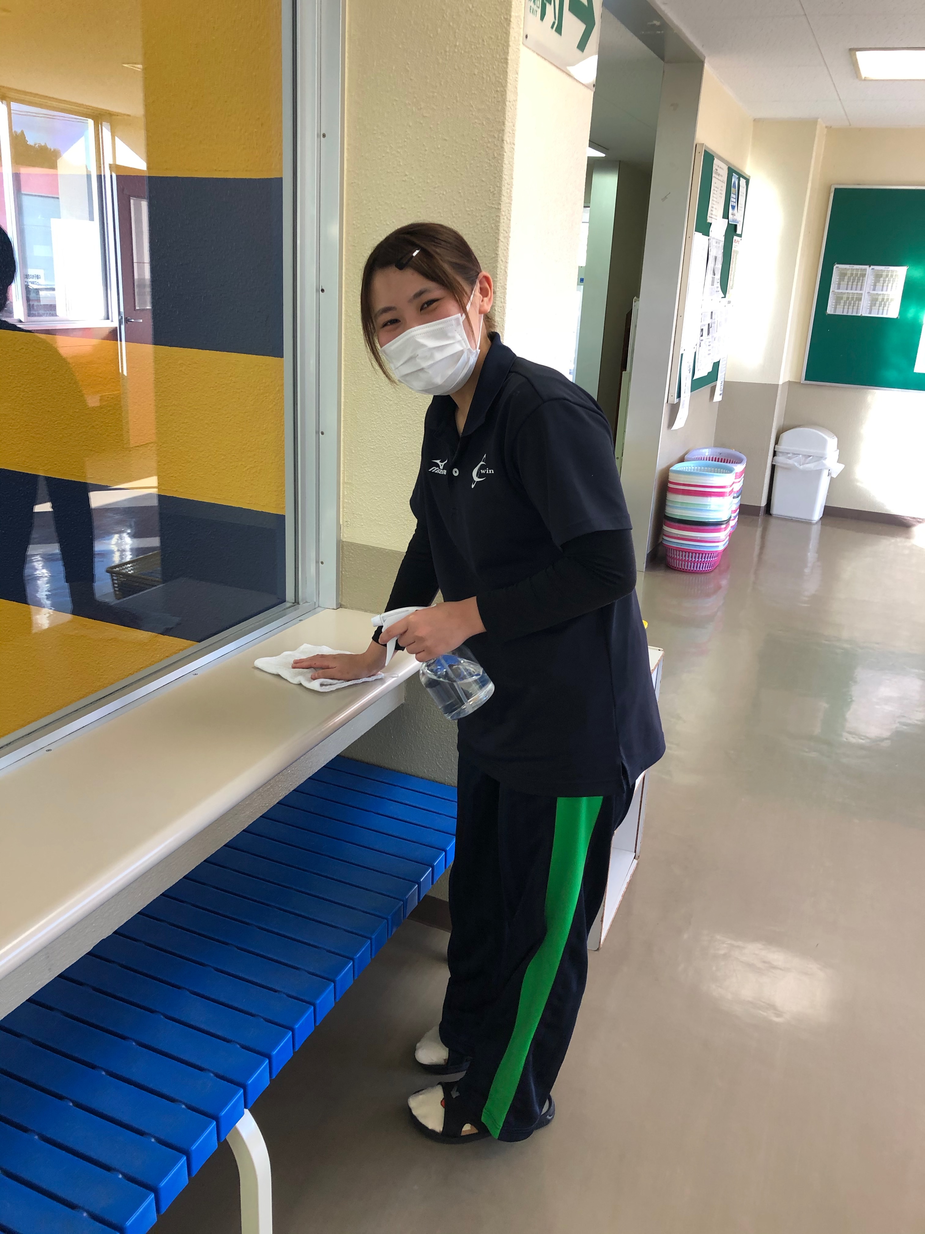 ジュニアコースでは各時間に、イスやテーブル、ロッカーやトイレなどアルコール消毒を行なっております。