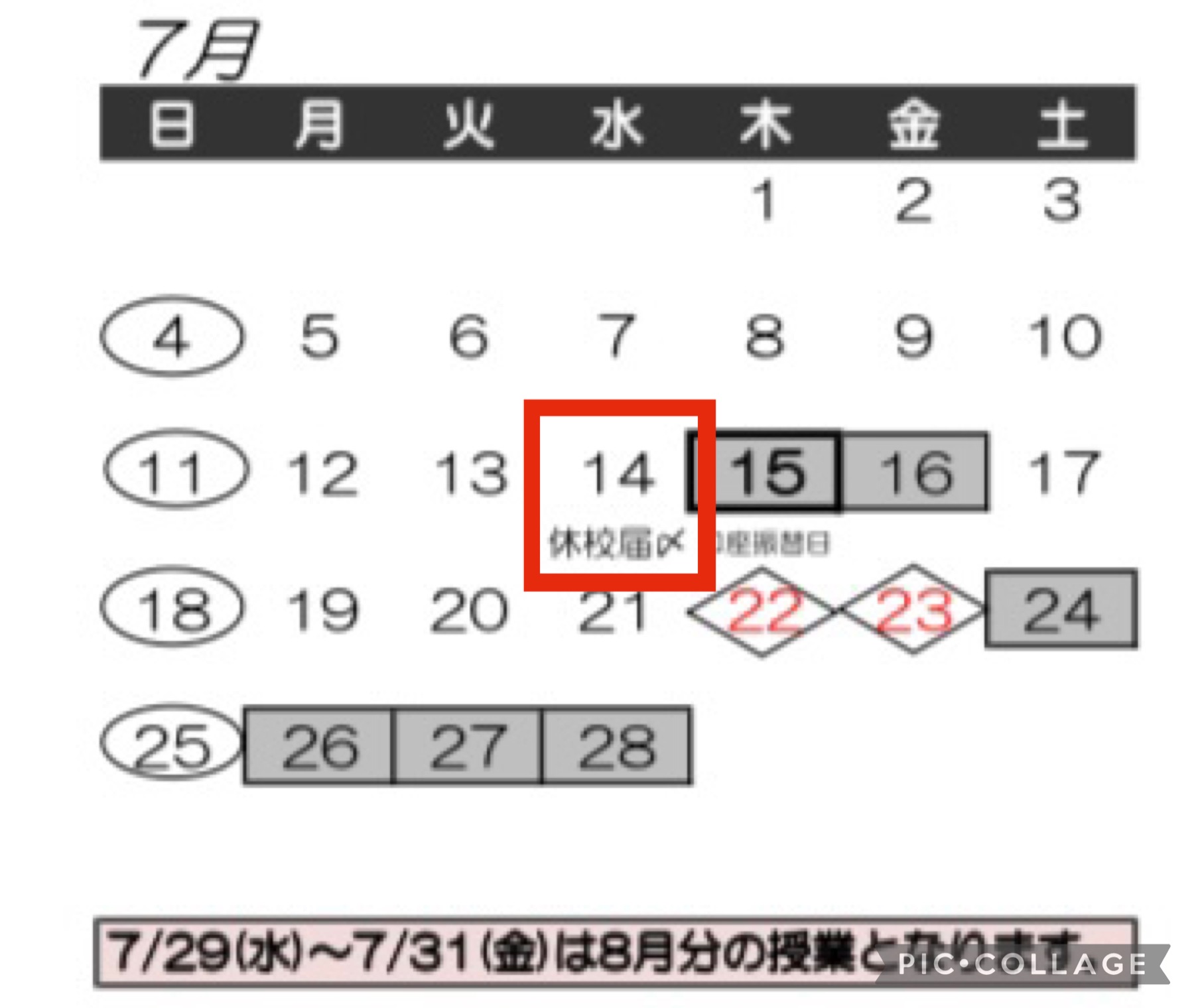 スクールカレンダー『休校届〆』と